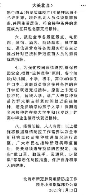 7月12日,廣西桂平市新型冠狀病毒肺炎疫情防控指揮部發出通告:凡年滿18周歲以上(戶籍不限)且無疫苗禁忌癥的人員均須接種。為強化校園疫情防控,確保校園安全,根據“應種盡種”原則,各個階段(幼兒園,小學,初中,高中)的學生戶口本上家庭成員符合接種條件的在開學前就近完成接種。原則上未完成接種的,暫緩入學。