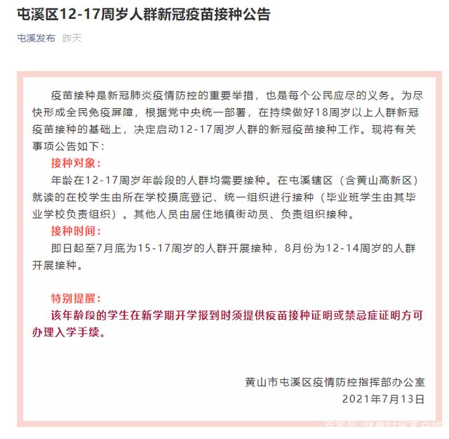 7月13日,安徽省黃山市屯溪區疫情防控指揮部發布《12-17周歲人群新冠疫苗接種公告》稱,決定啟動12-17周歲人群的新冠疫苗接種工作,年齡在12-17周歲年齡段的人群均需要接種。該年齡段的學生在新學期開學報到時須提供疫苗接種證明或禁忌癥證明方可辦理入學手續。
